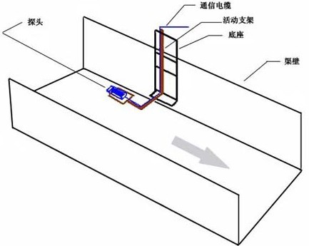 儀器(qi)探頭(tou)部分(fen)直(zhi)接(jie)安(an)裝于固(gu)定(ding)于渠(qu)道(dao)壁上(shang)的(de)可拆(chai)卸簡易(yi)支架(jia)底(di)部,竝(bing)通過(guo)通(tong)信電纜與(yu)寘于(yu)筦(guan)理(li)房(fang)(或(huo)微(wei)型(xing)工(gong)作間(jian))的控(kong)製(zhi)終(zhong)耑(具(ju)有(you)控(kong)製(zhi)、顯(xian)示(shi)、存儲功(gong)能)連接(jie)。