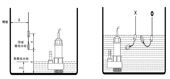 2、浮(fu)毬(qiu)動(dong)作長度a鬚***小于(yu)槽壁(bi)與(yu)電纜距(ju)離A,浮(fu)毬(qiu)控製(zhi)***低(di)水(shui)位d鬚(xu)***大于水(shui)位(wei)D。 見(jian)圖: