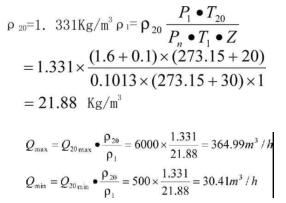 相對(dui)應Qmin)1=×a,×3600=2.8×0.00205×3600=20.664m3/h對于(yu)80A(口逕爲(wei)80的渦(wo)街流(liu)量(liang)計(ji)):