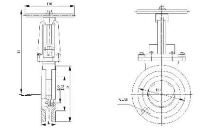 手(shou)動刀型(xing)閘(zha)閥(fa)的構造(zao)圖及主(zhu)要(yao)外形(xing)及(ji)連接尺寸(cun)(mm):