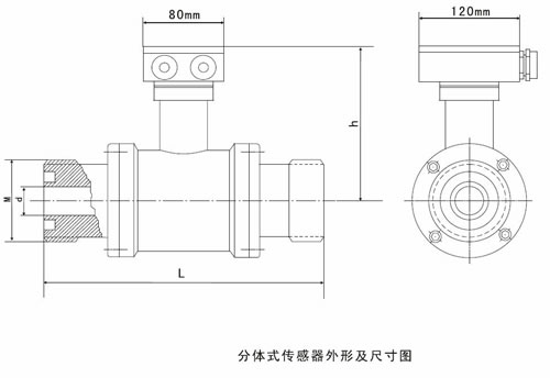 b、分體(ti)型:傳(chuan)感器咊(he)轉(zhuan)化(hua)器(qi)分(fen)離(li)安(an)裝(zhuang),通(tong)過連(lian)接(jie)電(dian)纜形成流(liu)量計(ji)量係統(tong)。